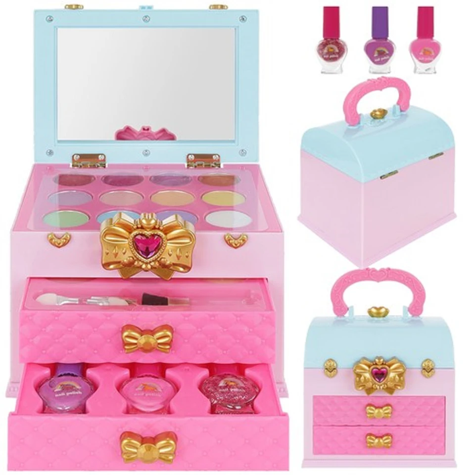 Ez a gyermekeknek készült sminkkészlet teljesen valósághű. A kozmetikumok egészségre ártalmatlan anyagokból készültek, így a gyermek számára biztonságosak. A gyümölcs formájú rózsaszín dobozban 3 elcsúsztatható fiók található, melyek különböző kozmetikumokat rejtenek. A készlet színes gélt, szemhéjfestéket, rúzst, szájfényt, körömlakkot és sminkecsetet tartalmaz.