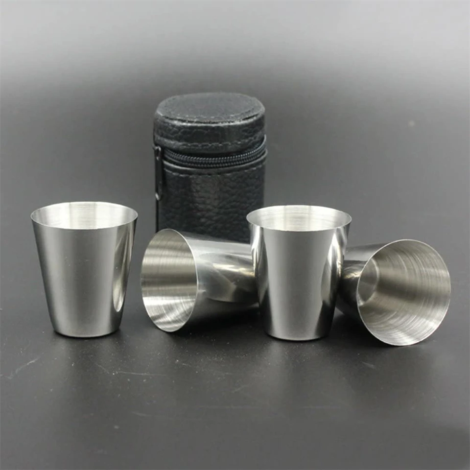 4 db-os fém stampedlis pohár garnitúra, cipzáras bőr tokban. Rendkívül praktikus kiegészítő kiránduló/síelő társaságok számára, de jó hasznát fogják venni horgászok, vadászok, vagy akár Te magad is, akárhol járj!