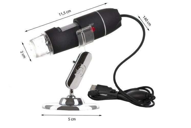 Fotók + videók - a készülék képes fényképeket és videókat készíteni. A mikroszkóp tapadókoronggal ellátott markolattal rendelkezik a készletben, amely lehetővé teszi a stabil megfigyelést. A fej 360 fokban elforgatható, így lehetővé teszi a pontos beállítást a nézett tárgyhoz. A készülék kézben is tartható.
