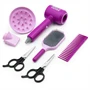 - A készlet tartalmaz egy hajszárítót, fésűket és ollókat