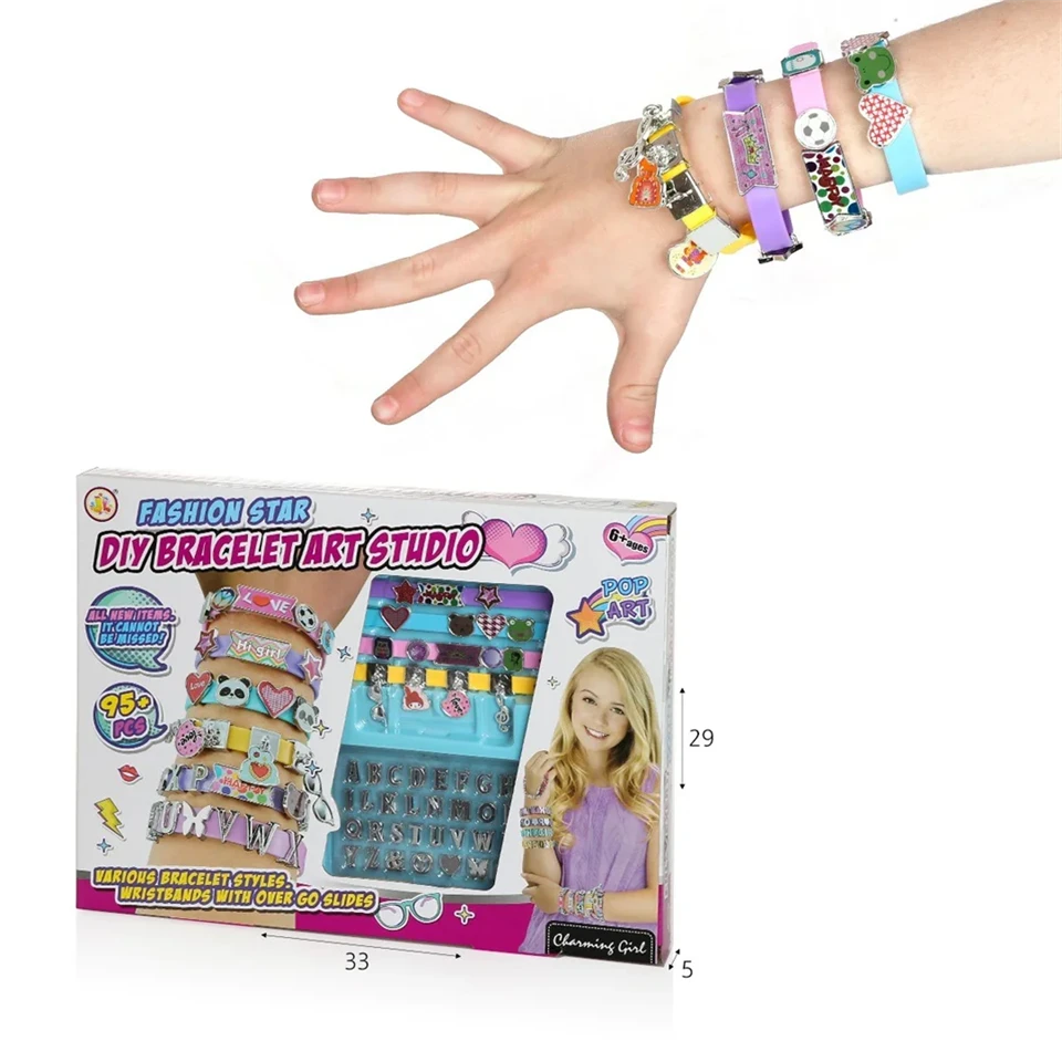 A karkötők színeit és formáit a saját kedve szerint kombinálhatja, kék, piros, sárga, rózsaszín és még megannyi színes szalag várja, hogy egyedi karkötőket készítsetek belőle. Az elkészült karkötők rugalmasak, nem szorítják a gyerekek csuklóját, a közepükre pedig egy dísz is felfűzhető amire az egyedi matricák közül bármelyiket felragaszthatjátok.