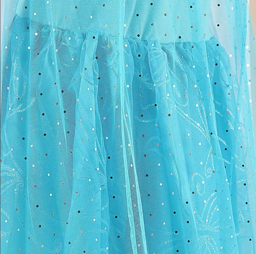 A világoskék színű ruha egy része csillogó anyaggal van borítva, mely varázslatos fényjátékot kölcsönöz. A derék részen elhelyezkedő ragyogó kristály tovább fokozza a ruha tündöklését, és gyönyörű fényeket kölcsönöz.