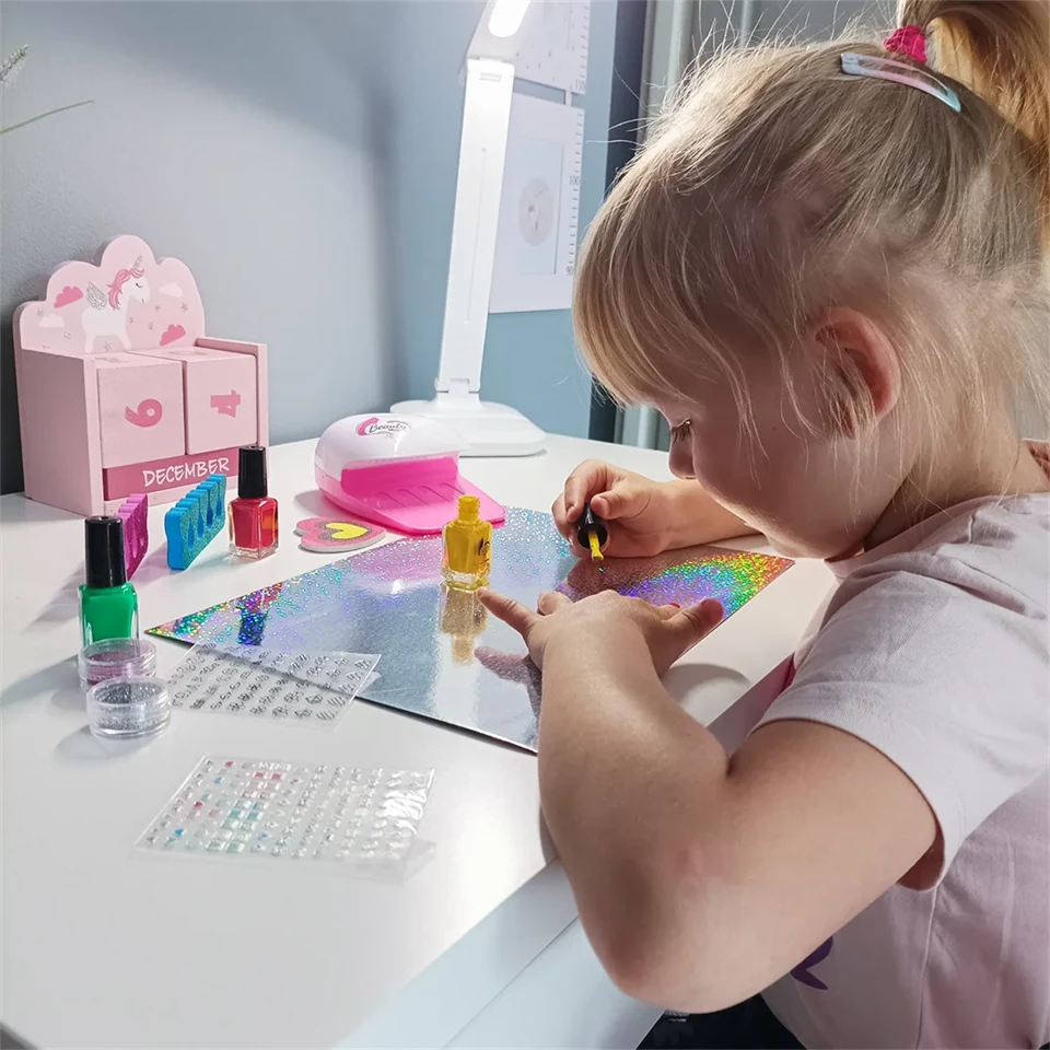 A játék fejleszti a kézügyességet, a kreativitást, az esztétikai érzéket, valamint türelemre és precizitásra tanít. A készlet egyetlen eleme sem tartalmaz káros anyagot, így használata maximálisan biztonságos, a gyermek körme ép és egészséges marad. A körömstúdió szárítóval egy remek ajándékötlet, melynek kislánya garantáltan örülni fog!