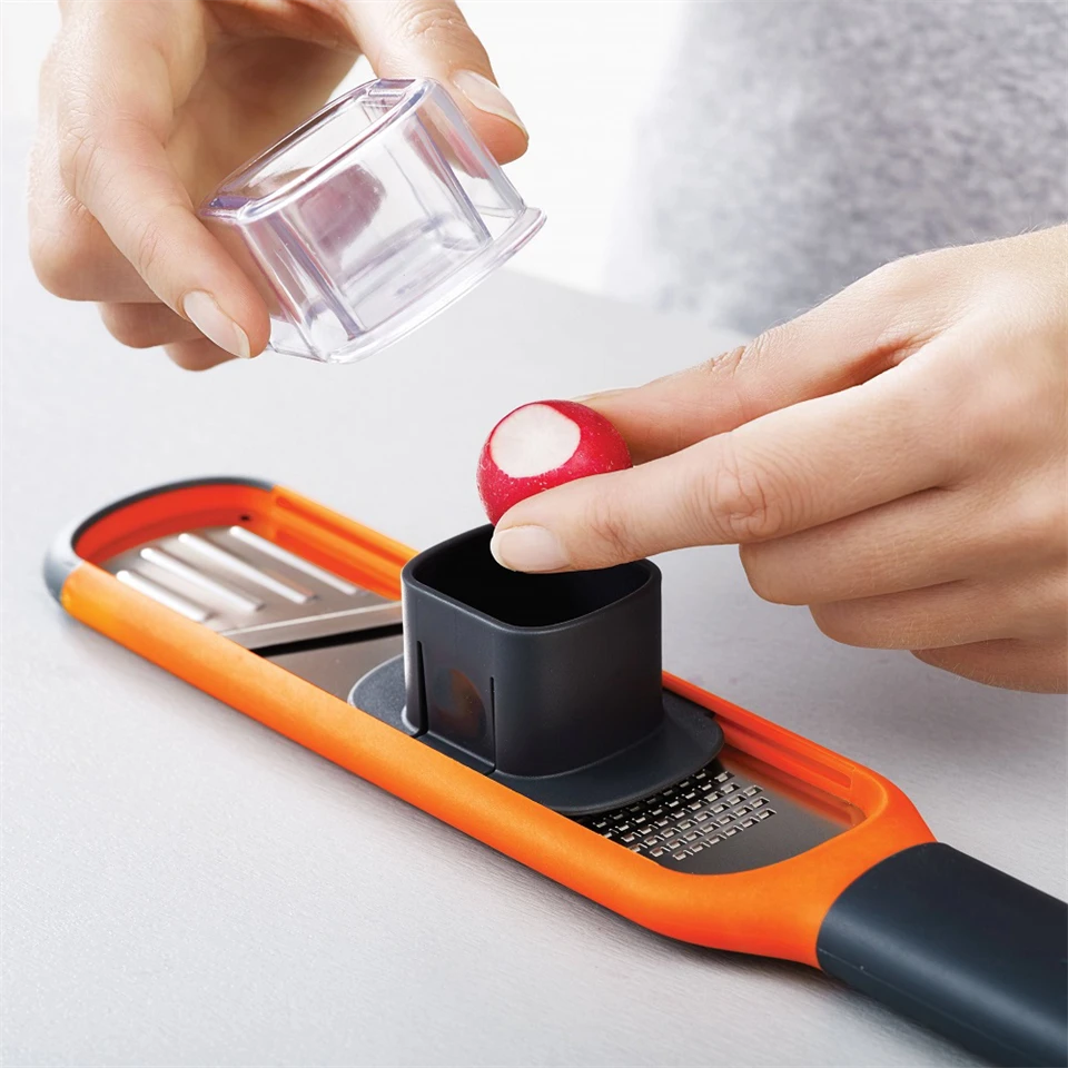 A Multifunkciós konyhai reszelő és szeletelő egyaránt alkalmas zöldségek, gyümölcsök és csokoládé reszelésére, szeletelésére, így nélkülözhetetlen eszközévé válik a konyhai munkáknak. Az innovatív pengék révén könnyedén és hatékonyan végezhetőek el a feladatok, így időt spórolhatunk meg és kényelmesebbé tehetjük a főzést és sütést. Az ergonomikus foglalat pedig biztonságos és kényelmes fogást biztosít. A narancssárga szín pedig különlegessé és vidámabbá teszi az eszközt, ami feldobja a konyhai munkákat.