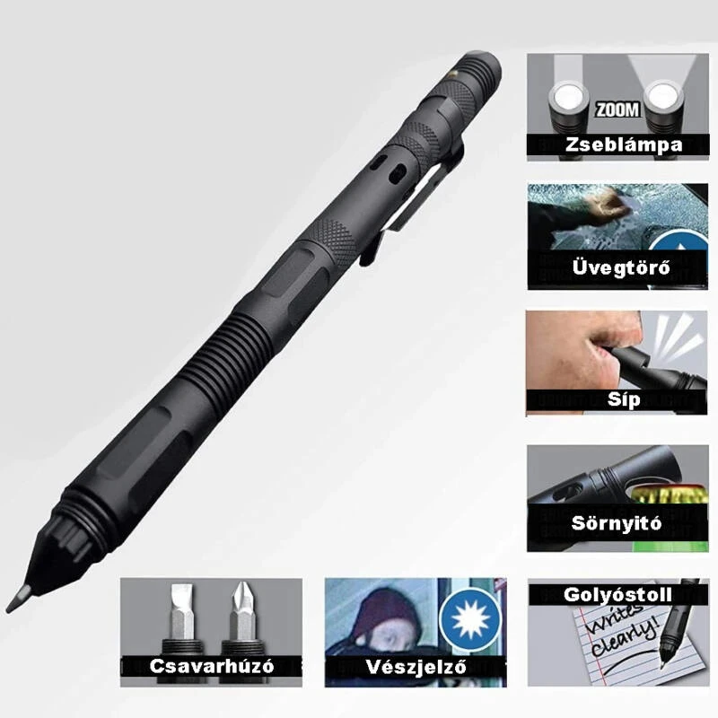 Erős, fém házba épített, számtalan funkciót kínáló, kis méretű, kompakt taktikai túlélő eszköz. Mérete alig nagyobb egy hagyományos golyóstollnál, tudásban viszont messze felülmúlja azt! Találhatunk benne üvegtörő kalapácsot, lapos- és csillagcsavarhúzót, sörnyitót, vészhelyzeti sípot, többfunkciós zseblámpát fókuszálható fénnyel, valamint golyóstollat. A kis eszköz egy praktikus övcsipesszel van ellátva, így könnyen rögzíthető ruhára, táskára. A beépített LED lámpa körülbelül 0.5W teljesítményű, működtetéséhez 3 db LR44 típusú gombelem szükséges, melyet a csomag tartalmaz.